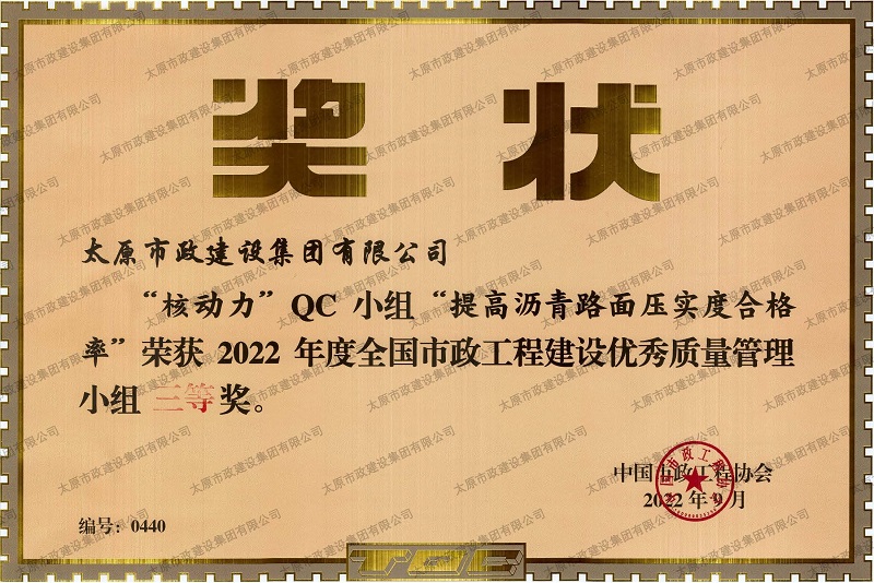 2022年度全國市政工程建設優(yōu)秀質(zhì)量管理小組三等獎_''核動力QC小組”提高瀝青路面壓實度合格率”